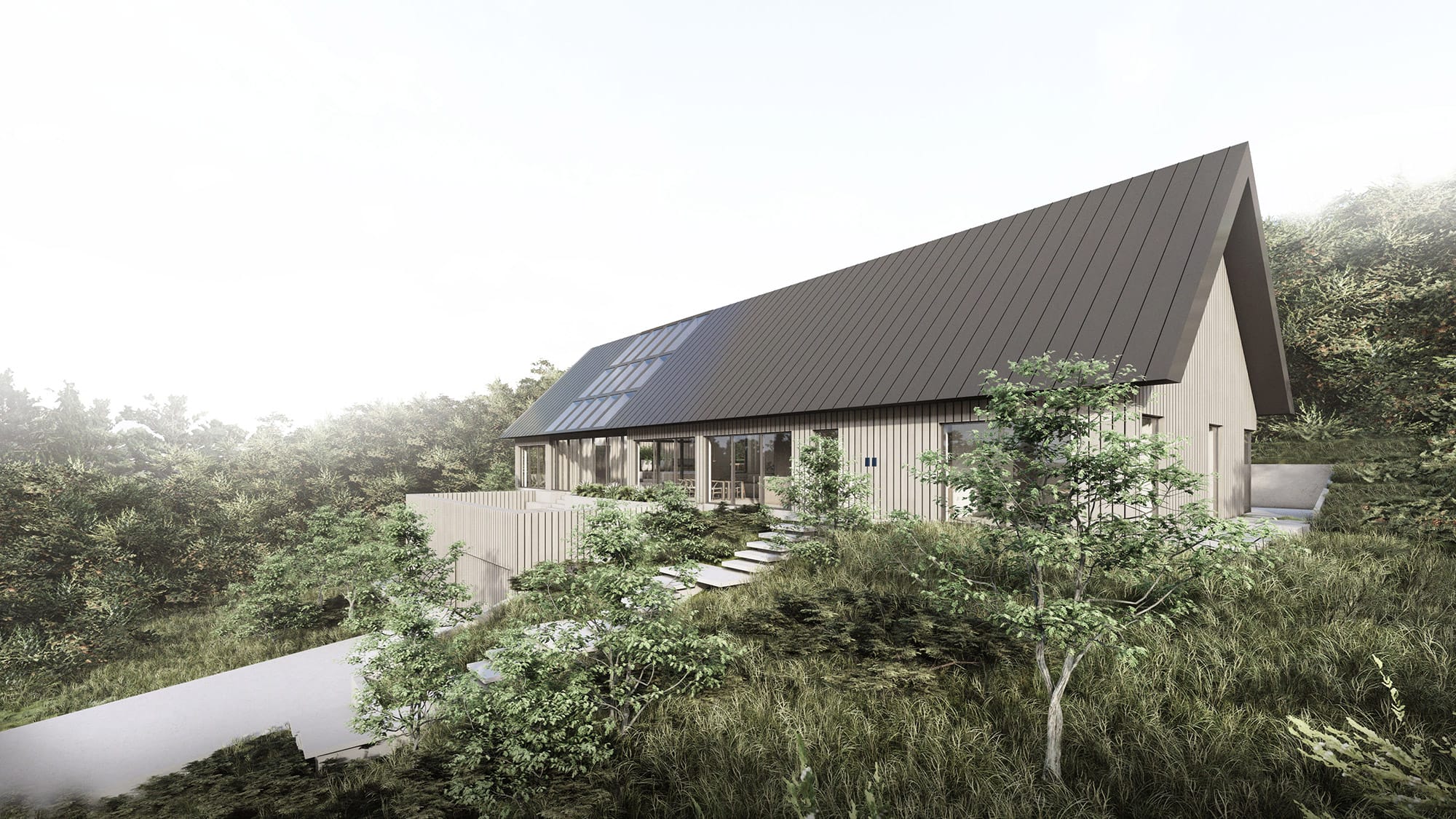 Annekset og huset bliver spændt sammen via tagkonstruktionen, så bygningsdelene syner som én samlet enhed. Dette giver mulighed for overdækket ophold, hvis man ønsker dette.