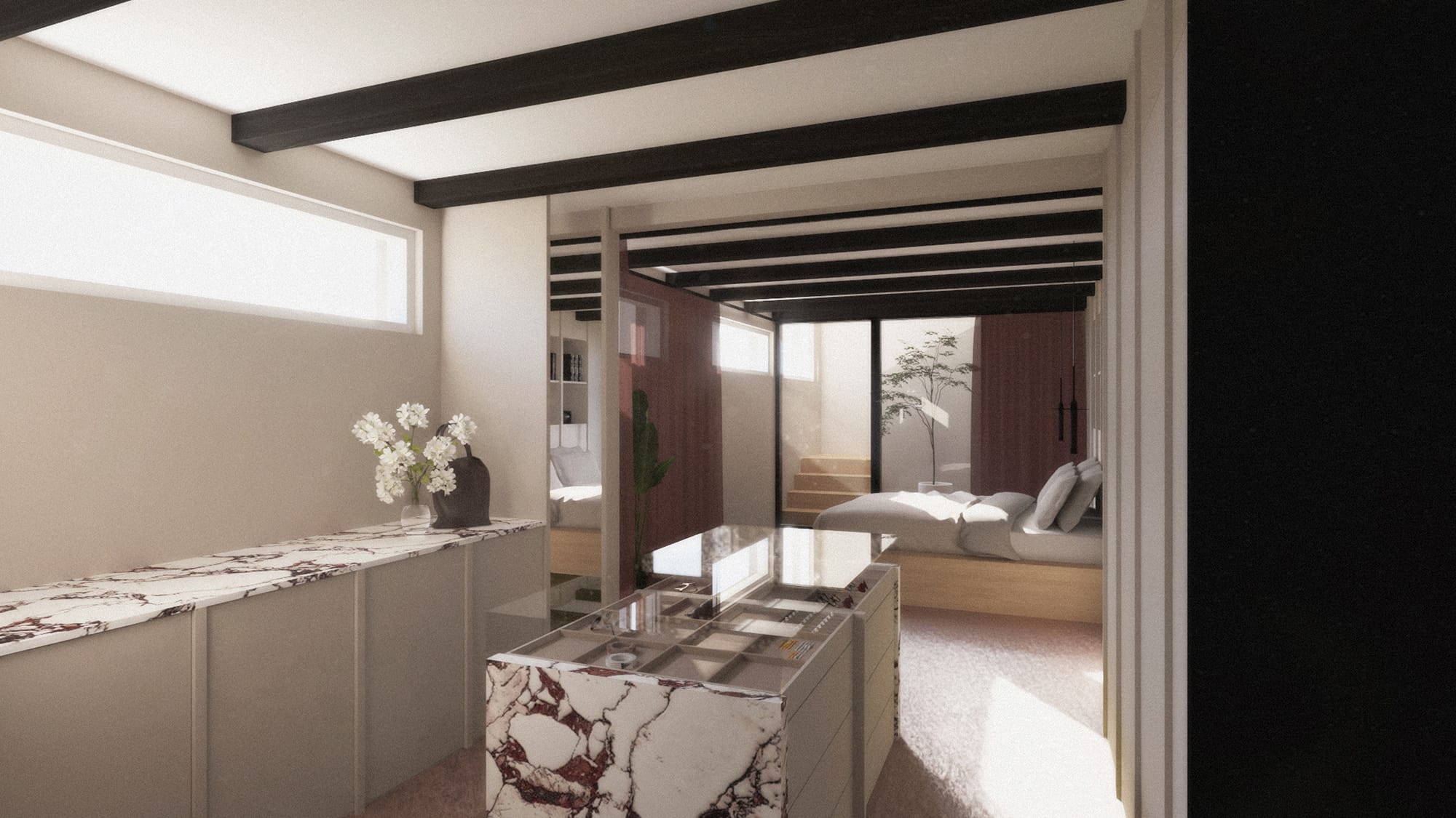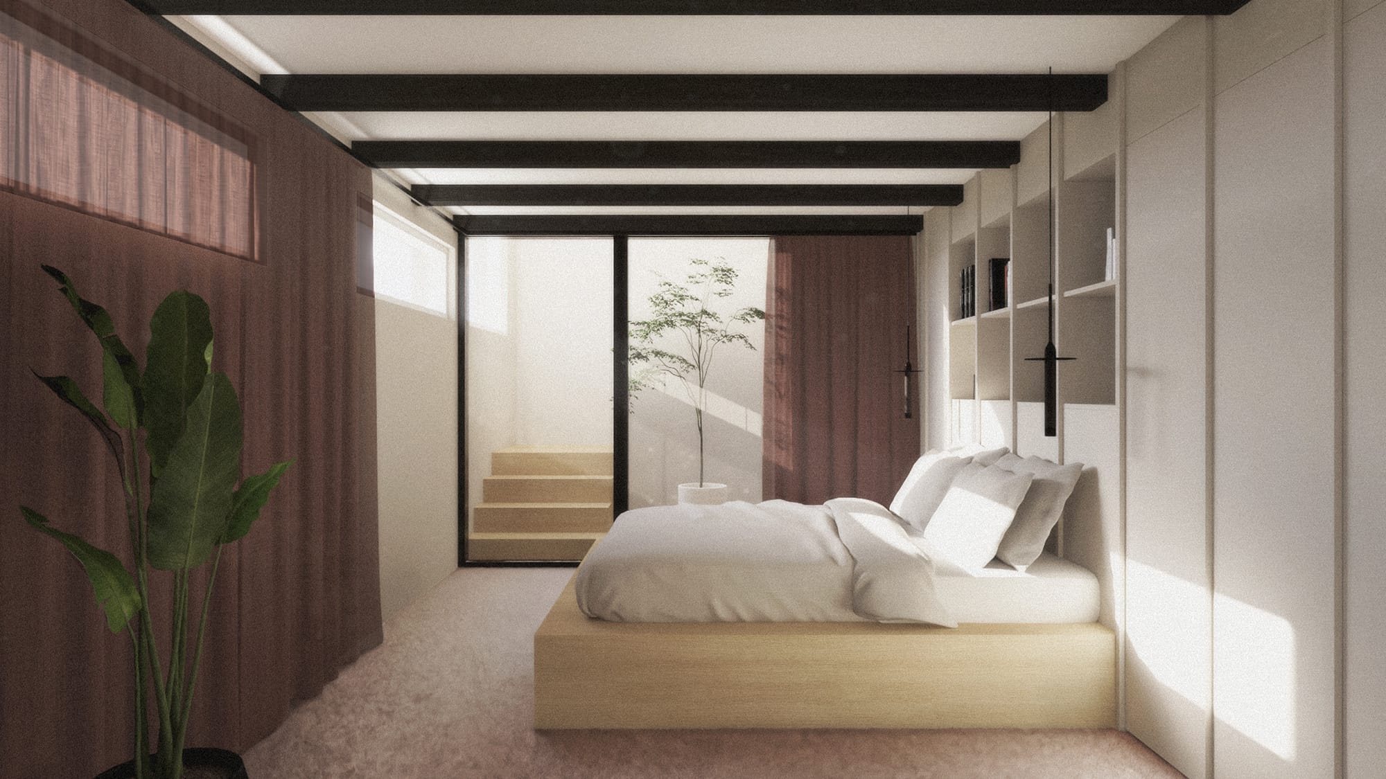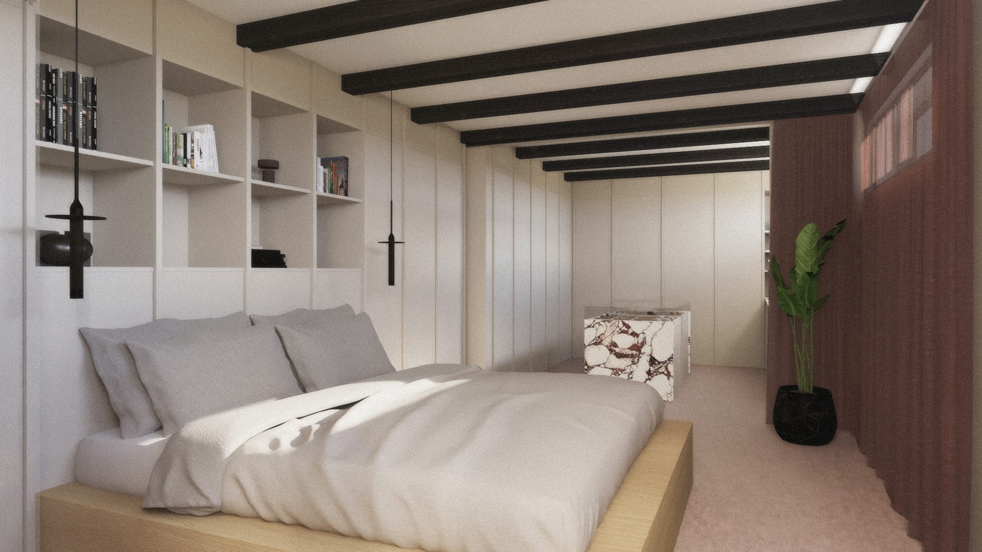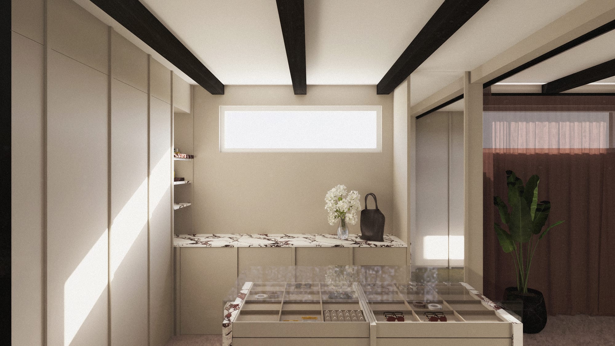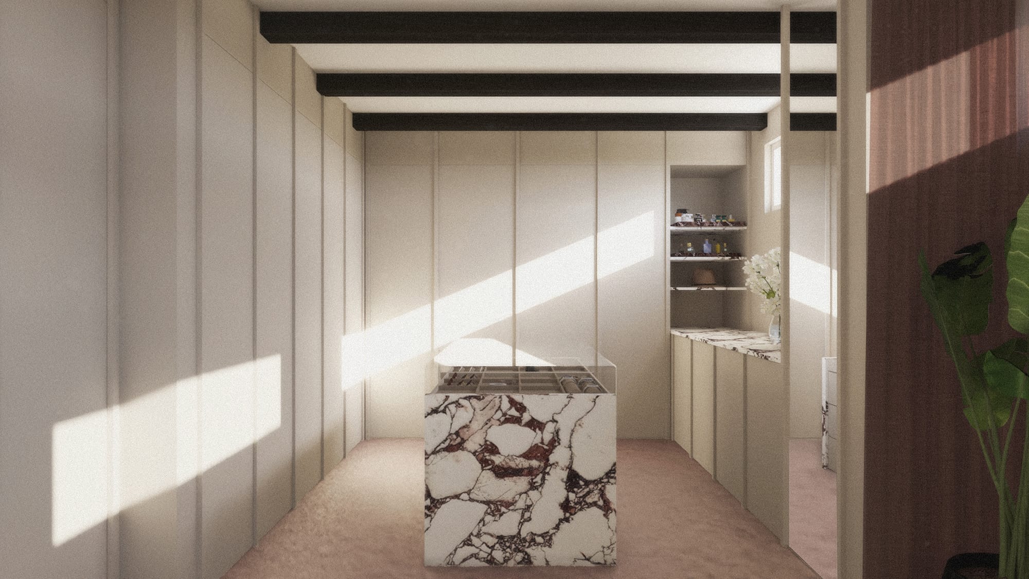 Fuld designmanual på mastersoveværelse samt walk-in. Her har tegnestuen designet inventar i form af seng, skabe, hylder og montre til accessories. Farvepaletten er lys og venlig, med rosa og bordeaux toner der kommer til udtryk i gardiner, tæppe og marmoren i walk-innet.