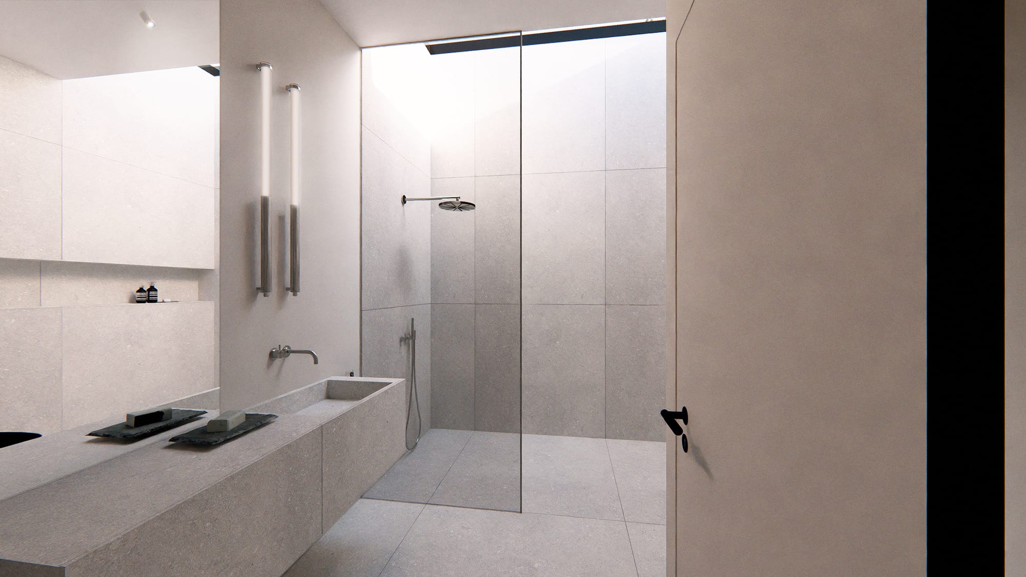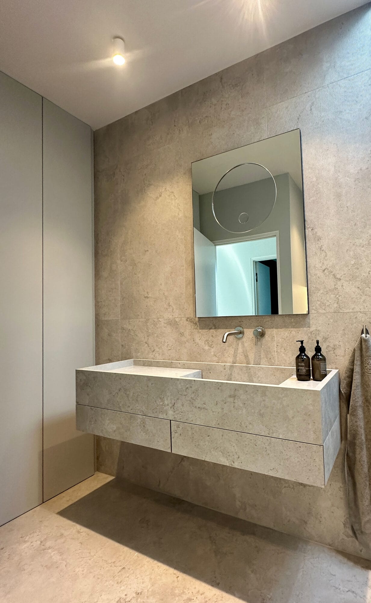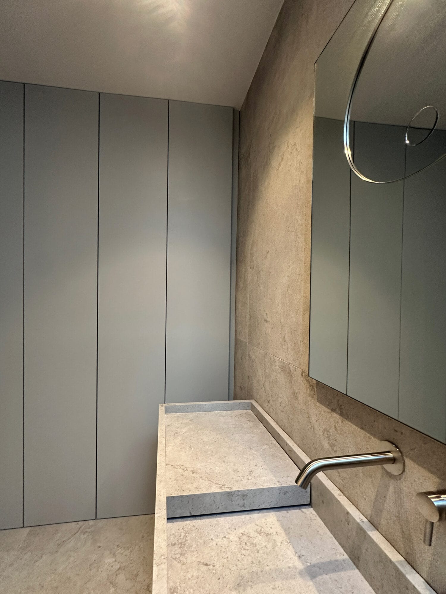Fuld designmanual på mastersoveværelse samt walk-in. Her har tegnestuen designet inventar i form af seng, skabe, hylder og montre til accessories. Farvepaletten er lys og venlig, med rosa og bordeaux toner der kommer til udtryk i gardiner, tæppe og marmoren i walk-innet.