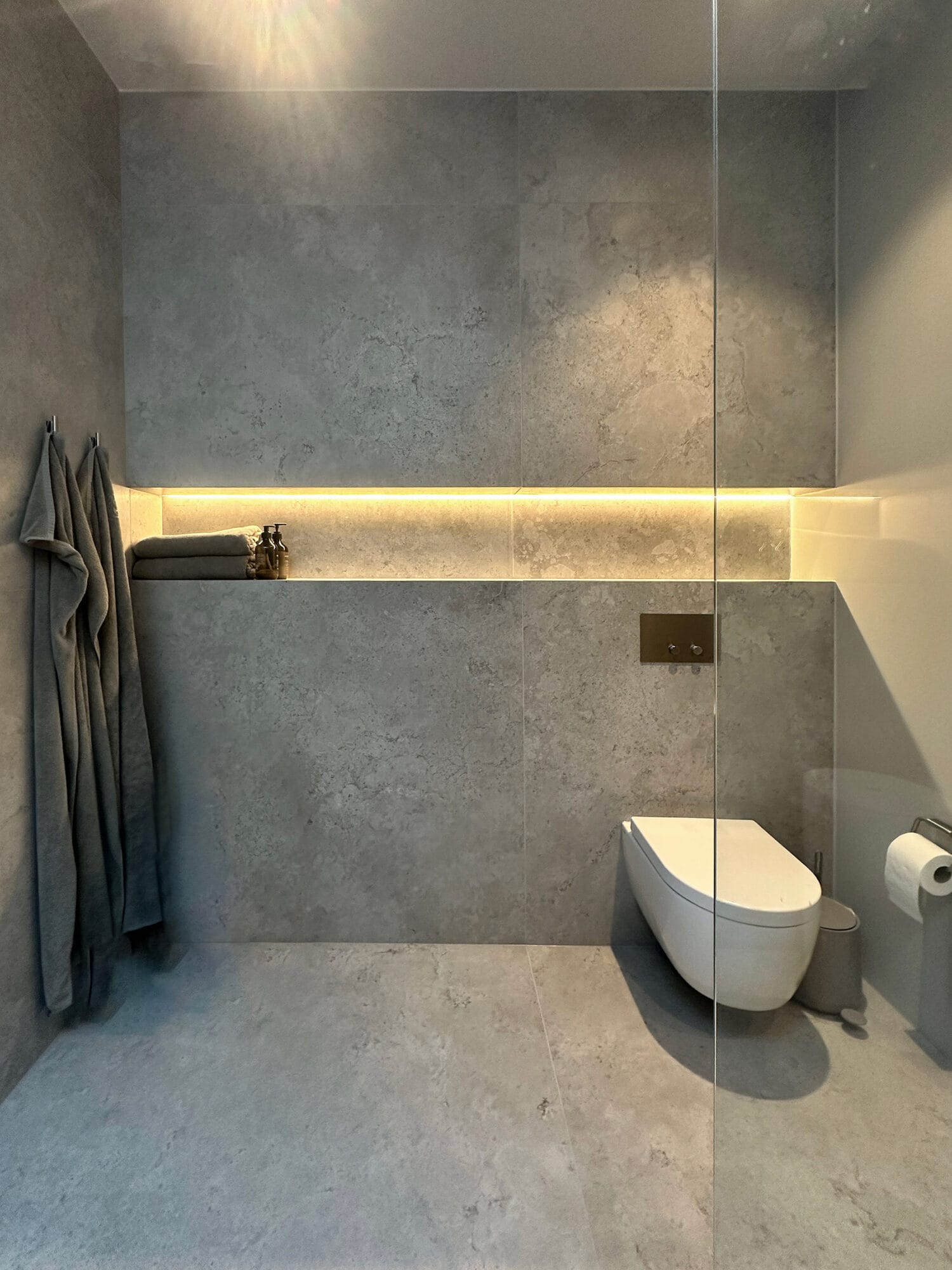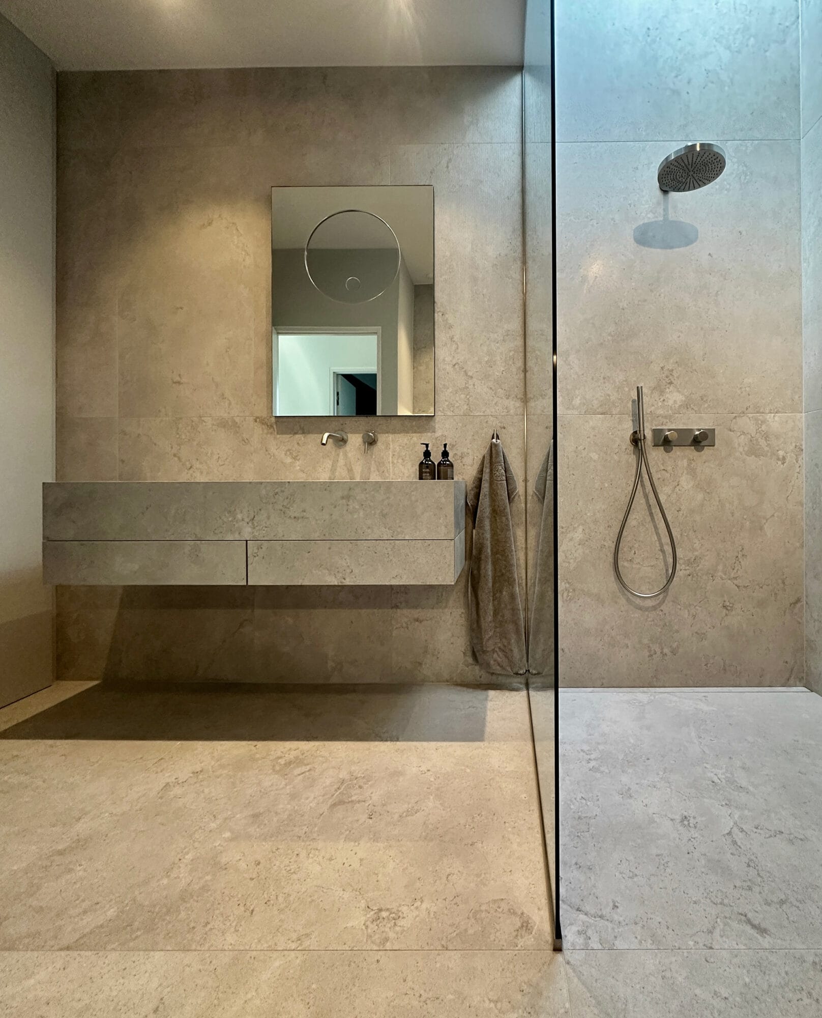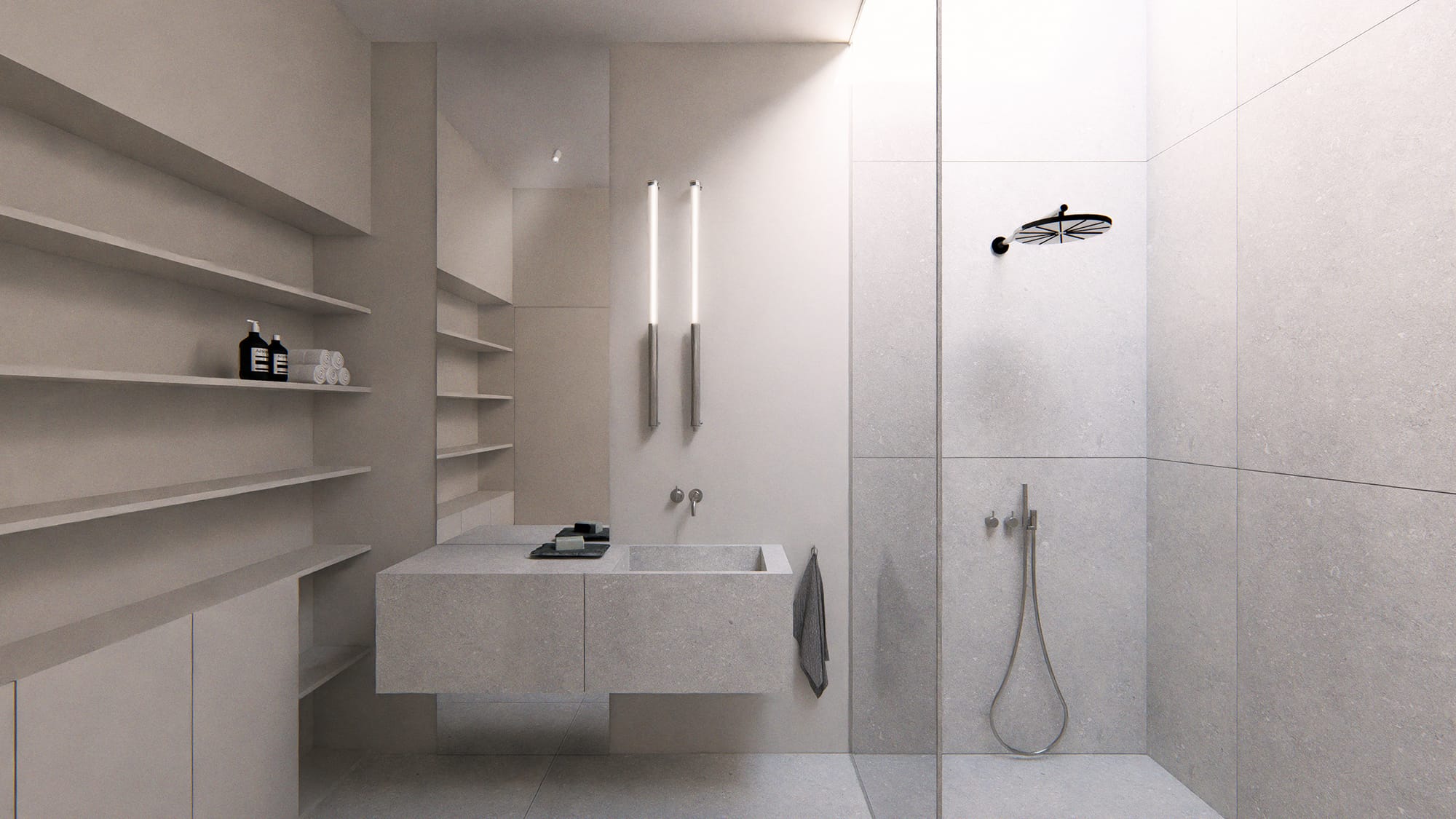 Fuld designmanual på mastersoveværelse samt walk-in. Her har tegnestuen designet inventar i form af seng, skabe, hylder og montre til accessories. Farvepaletten er lys og venlig, med rosa og bordeaux toner der kommer til udtryk i gardiner, tæppe og marmoren i walk-innet.