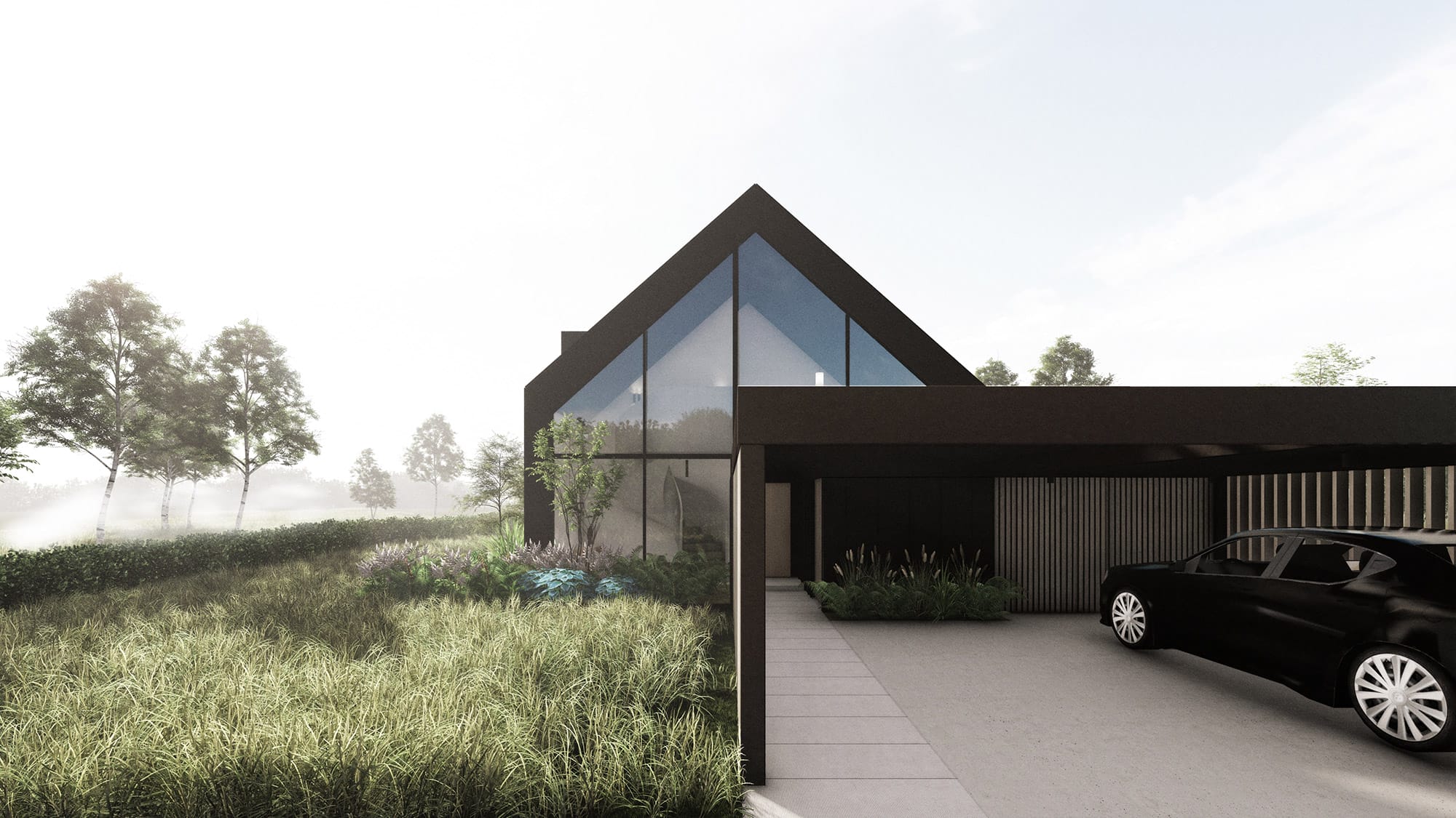 Saddeltagshuset fremstår skarpt i stål. Carporten kobler sig på saddeltagshuset som en skarp flade, ligesom der mod haven er lavet en overdækket terrasse, der ligeledes kobler sig på som en ramme.