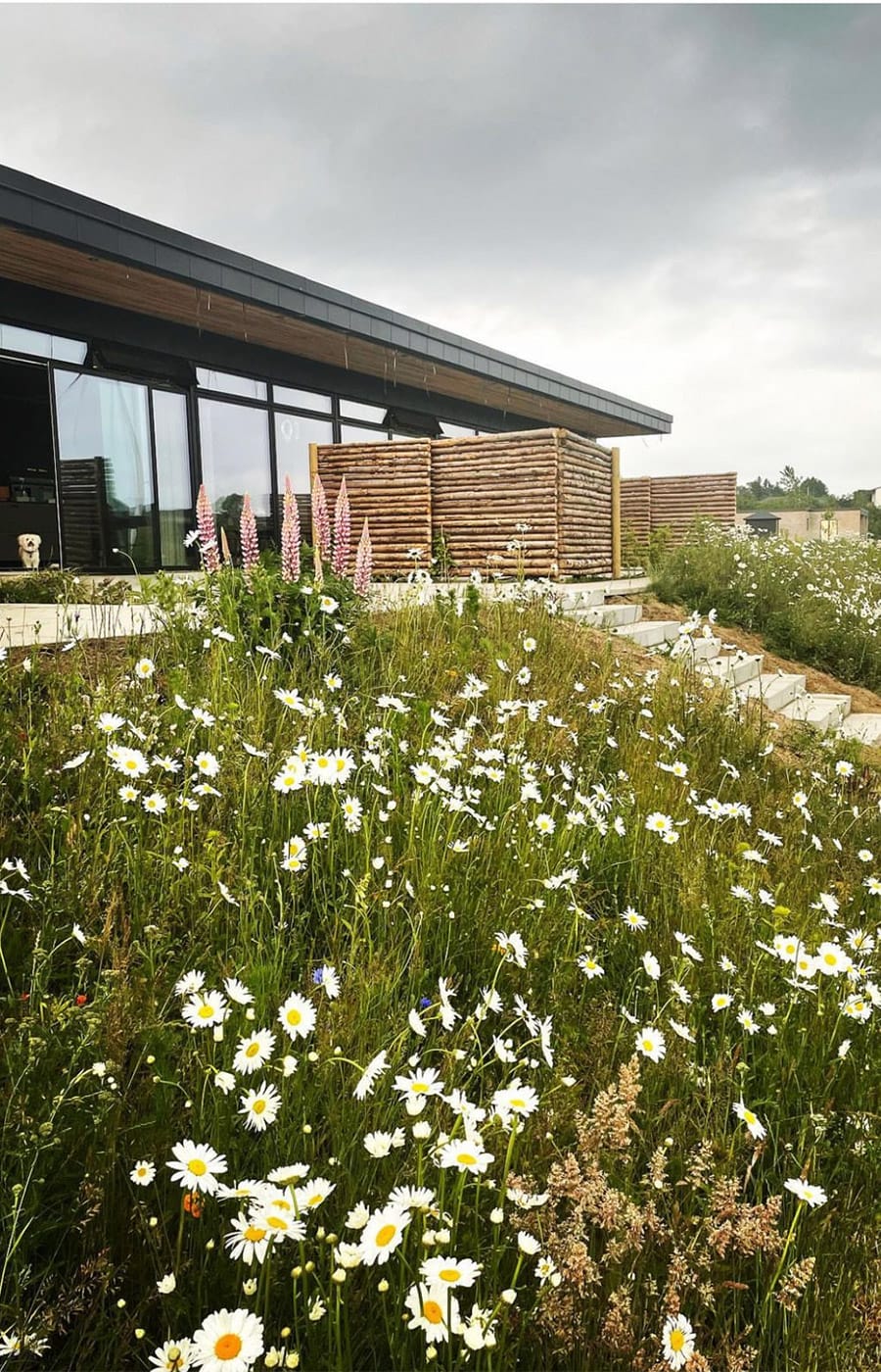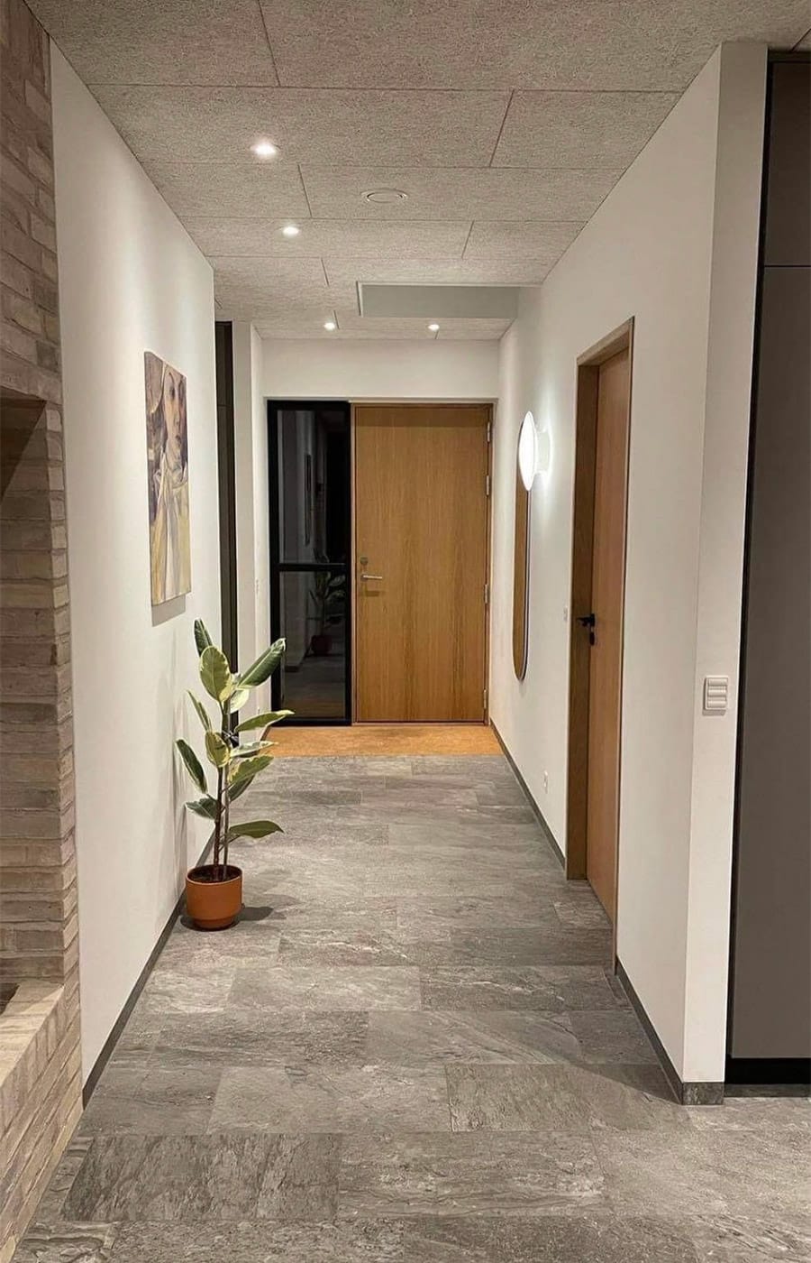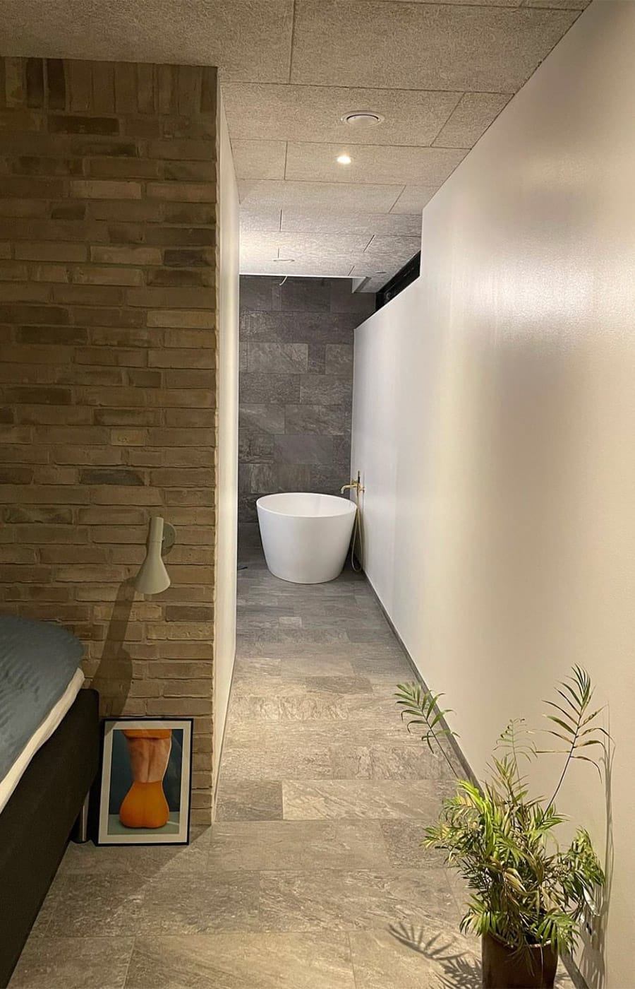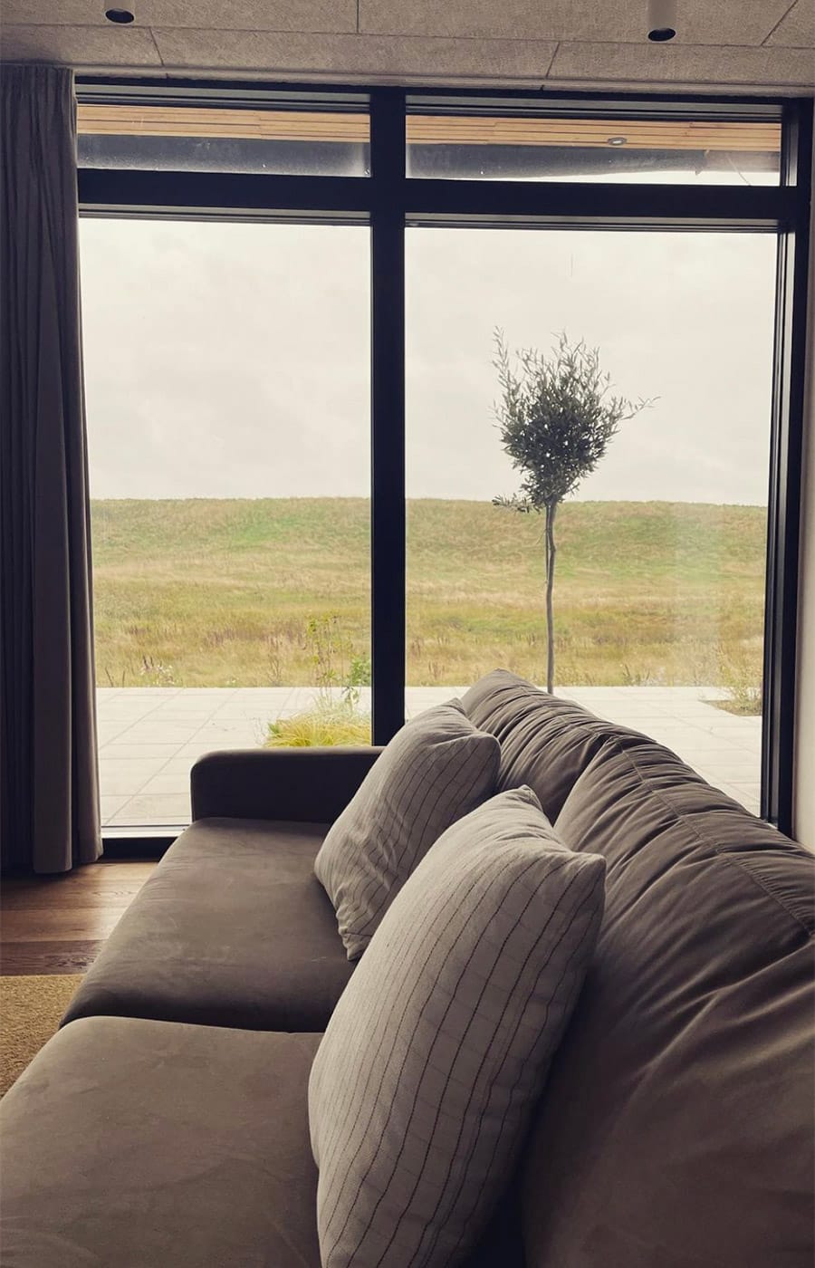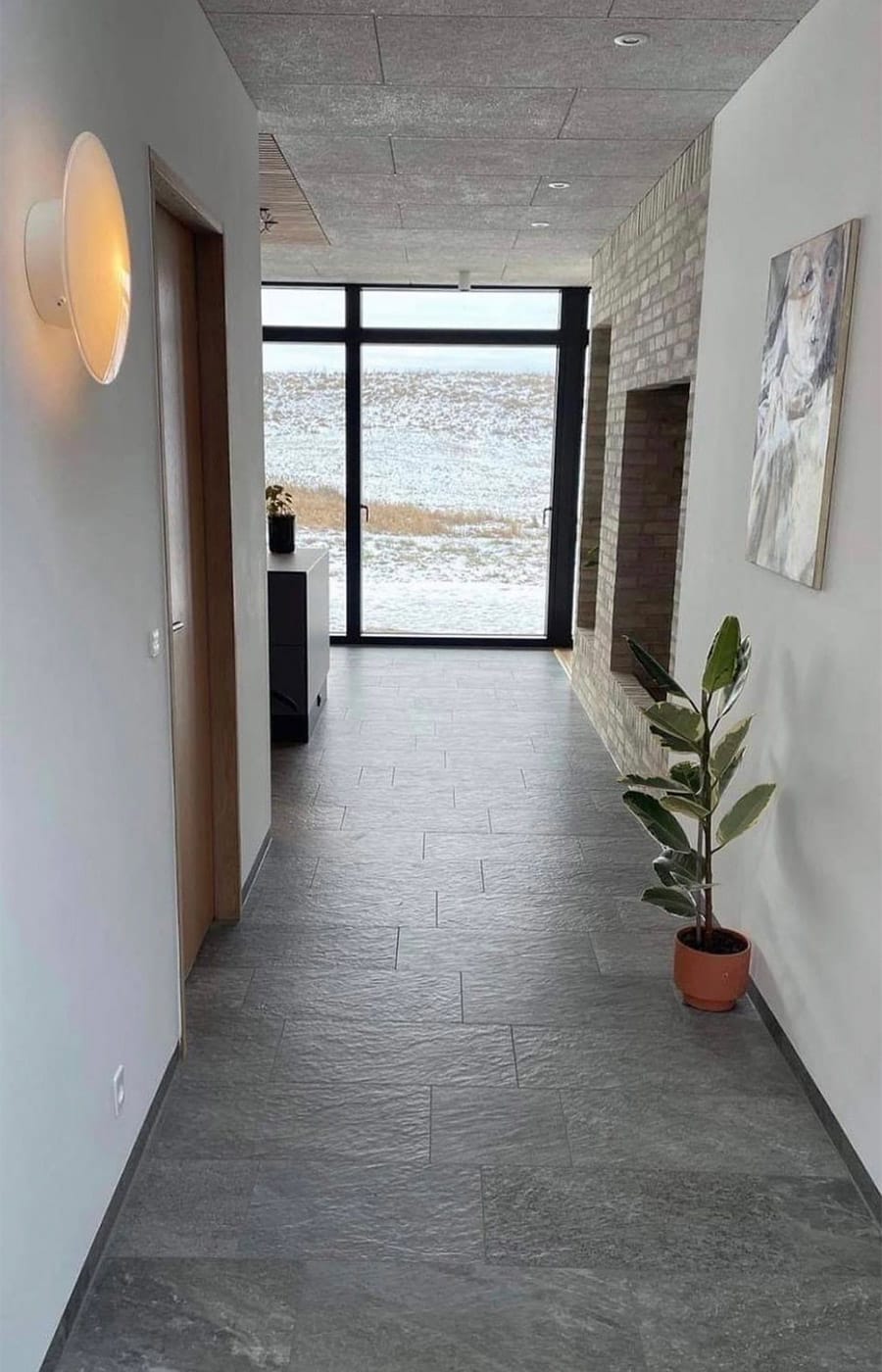 Villaen tegner sig som et længehus på en åben naturgrund. Bag den enkle facade mod nord er husets private funktioner samt villaens indgang. Villaen åbner sig op mod syd, hvor villaens fællesrum er i kontakt med den omkringliggende natur. Et atrium spændes ud mellem hovedhus og garagebygning, hvilket giver et læfyldt og beskyttet uderum.