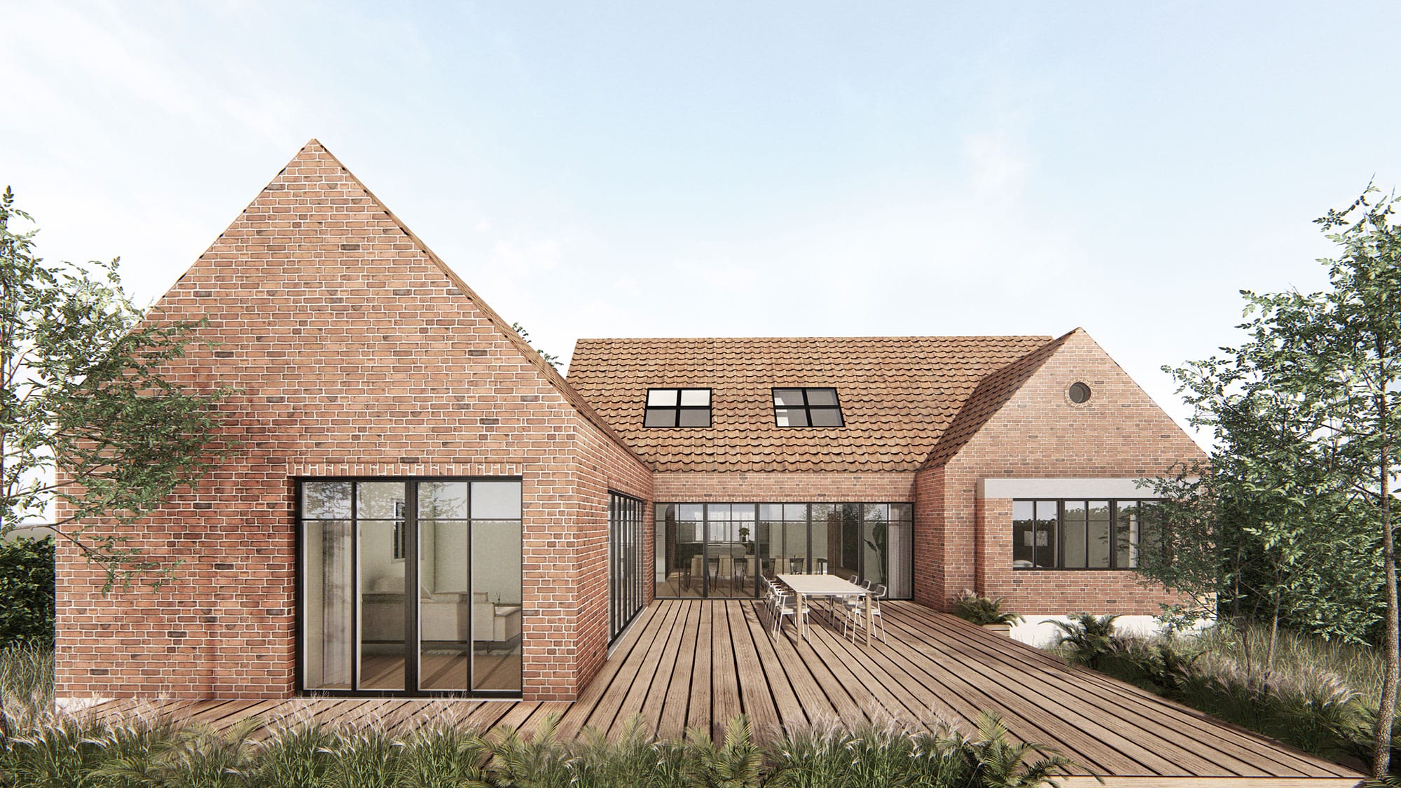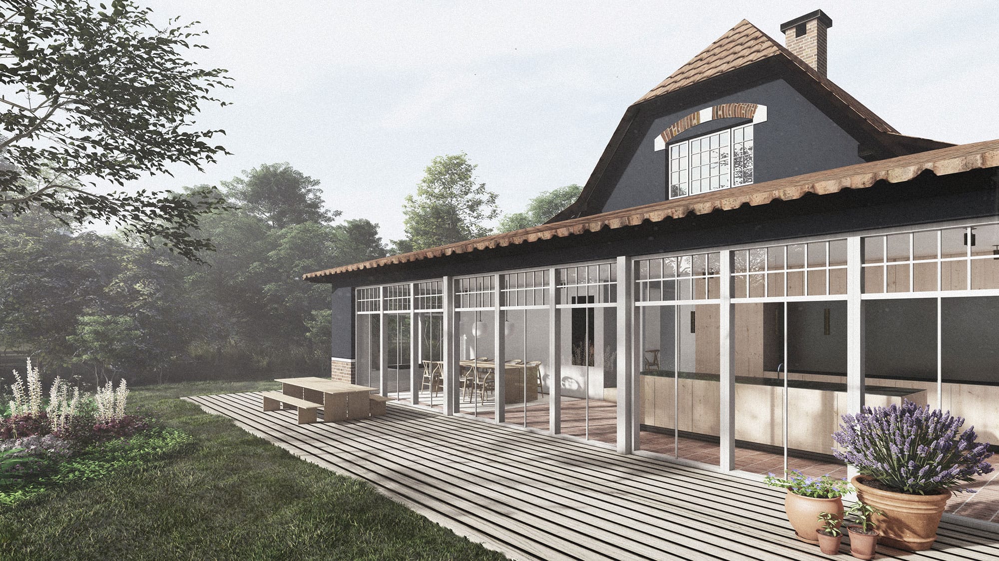 Mod syd og vest bygges huset til i et plan, i harmoni med det oprindelige hus. Tilbygningen kobler sig på huset som en pavilion med hældning på taget, der smelter sammen med husets tidligere tilbygning udført i 1940’erne. Her etableres rummelige leverum, med direkte forbindelse til husets smukke have, samt tre nye værelser. På dette projekt har vi udarbejdet fuldt belysningsprojekt samt projektering.